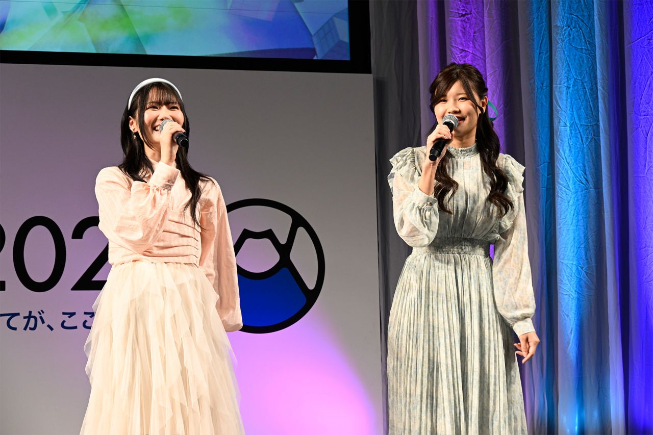 続いてトークはエンディング主題歌「Calling」について。小鹿さんは「この2人の絆みたいなものが歌詞にすごく描かれていますし、メロディもすごくポップで可愛くて、ラップ部分もあるので、きっと口ずさんで歌いたくなる曲だと思います」と紹介します。ここで、「Calling」が流れるメインPV第2弾がスクリーンに上映されると、きらびやかな映像と楽曲に、会場からは感嘆の声が上がりました。キャストたちも「可愛い!」を連発。橘さんと小鹿さんは、映像を見ながら小さく踊る姿が印象的でした。